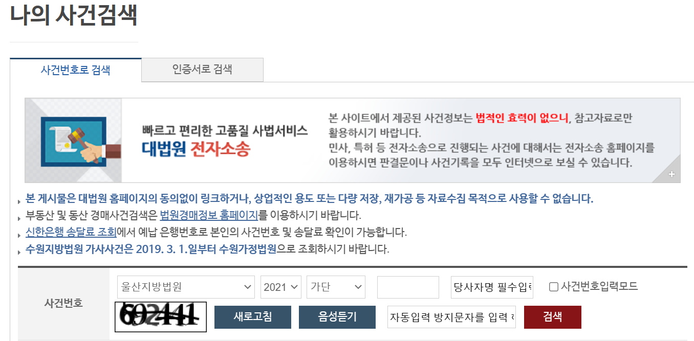 위 대법원 나의사건검색에서 관할법원, 사건번호, 소송 당사자 이름, 자동입력방지 문자를 입력하면,