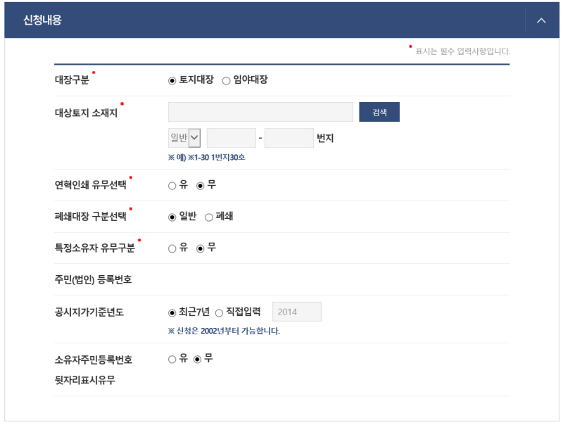 이제 아래 처럼 토지의 소재지를 입력하고 프린터로 출력하면 됩니다.