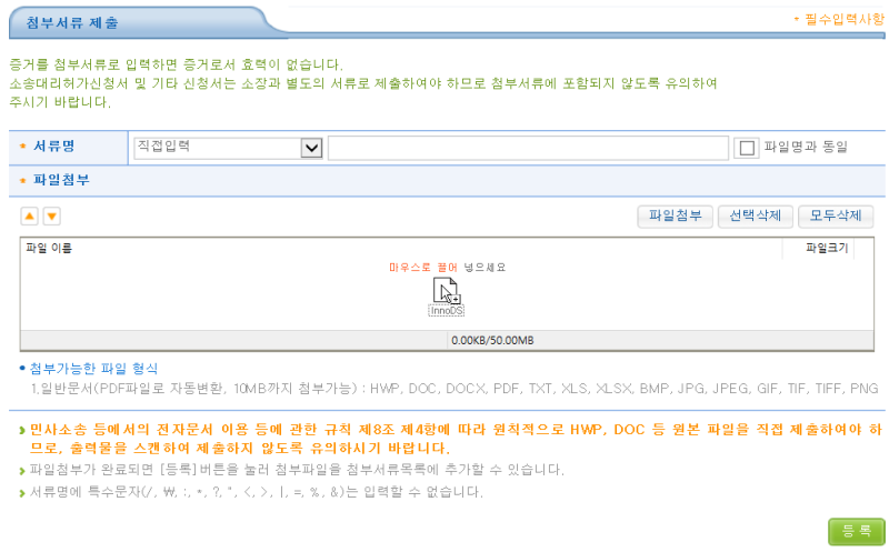입증서류는 pdf, jpg 등 일반 서증은 10MB까지 가능. 10MB를 넘는 경우, 개인적으로는 알PDF를 사용하여 용량을 줄이는 작업을 함.또는 100장 짜리 서증을 20장씩 정도로 쪼개서 제출함