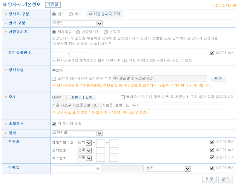 1) 원고 인적사항을 입력 후 저장