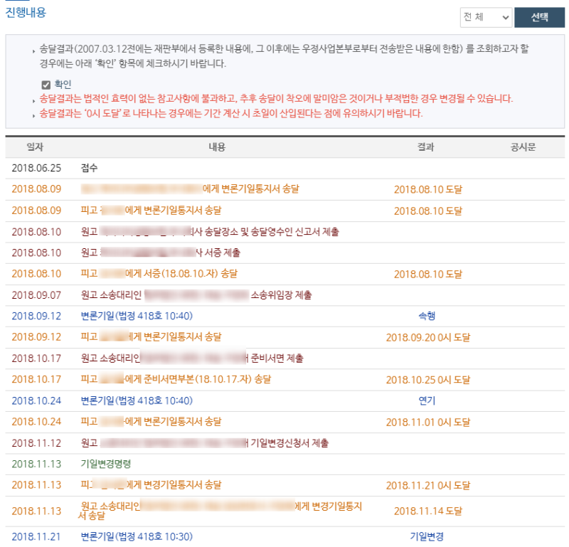 위와 같이 절차 진행상황을 확인할 수 있습니다. 법원으로부터 어떤 서류가 언제 송달되었고, 도달일이 언제인지 확인이 가능합니다.