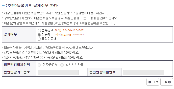주민번호는 기본으로 체크되어 있는 '미공개'로 하고 '다음' 버튼을 클릭