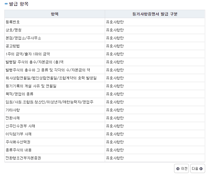 발급항목 최종 확인 후 '다음' 버튼 클릭