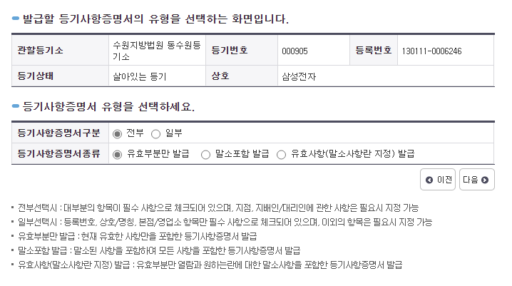 수원지방법원 동수원등기소 '본점'의 '선택'을 클릭하면