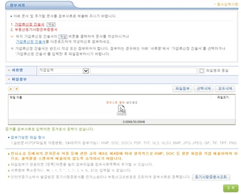 부동산등기사항전부증명서는 등기부를 스캔하여 업로드하면 됨.