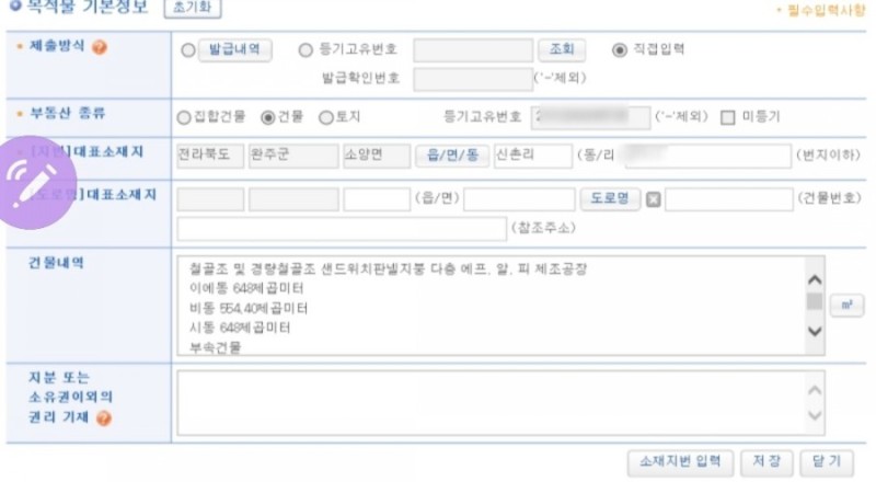 건물인 경우 등기부에 기재되어 있는 건물표시입력.