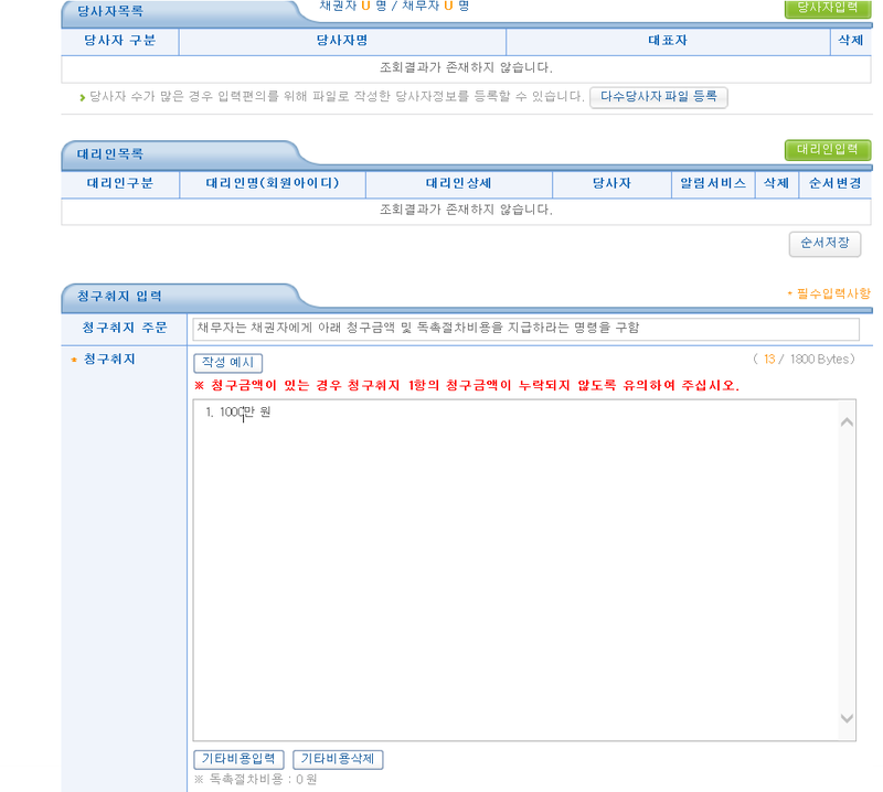 위 그림은 대법원 전자소송 사이트의 지급명령신청서 작성 화면입니다.