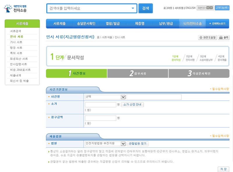 사건명(가령 대여금), 소가(가령 대여금의 원금), 청구금액을 기재하고 제출법원(상대방의 주소지 관할법원)을 선택합니다.