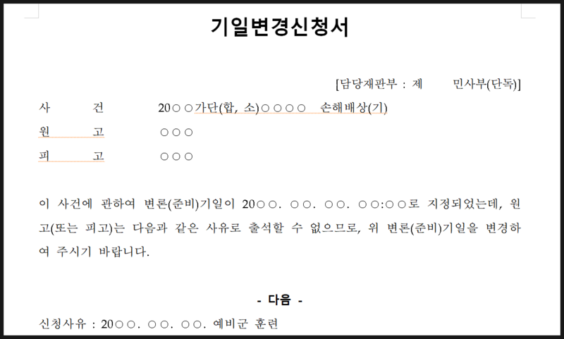 6. 기일변경신청서의 예시문구를 참조하여 작성 후 법원에 접수하면 됩니다.